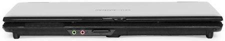 Спереди вынесены аудиоразъемы и кард-ридер. Слева от них на скошенной грани находятся семь индикаторов, информирующих о работе тех или иных режимов клавиатуры (Num Lock, Caps Lock, Scroll Lock), жесткого диска, беспроводной сети, а также о процессе зарядки ноутбука.