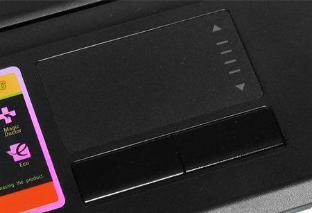 Сенсорная панель имеет средние размеры, хотя, на наш взгляд, можно было бы сделать ее немного большей по высоте. Ее правая часть отмечена как область для скроллинга. Кнопки под тачпадом имеют глянцевое покрытие. Несколько непонятно, зачем было это сделано. Да, глянец придает больше лоска изделию, но в данном случае площадь кнопок совсем маленькая (относительно всего ноутбука), да и корпус вокруг имеет пепельно-черный цвет. Кнопки выглядят просто как "более черные" либо вообще почти никак не выделяются на фоне общего экстерьера ноутбука.
