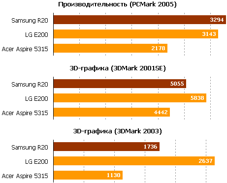 В 3DMark 2001 Samsung R20 отстает от своего главного соперника – LG E200, основанном на таком же чипсете и более слабом ЦП, но большим объемом ОЗУ. Однако отстает не столь значительно. А вот в 3DMark 2003 ситуация совсем плохая. Рассматриваемый ноутбук находится в аккурат между Aspire 5315 и E200, причем от последнего отстает весьма существенно. Хотя ему положено быть на первом месте.