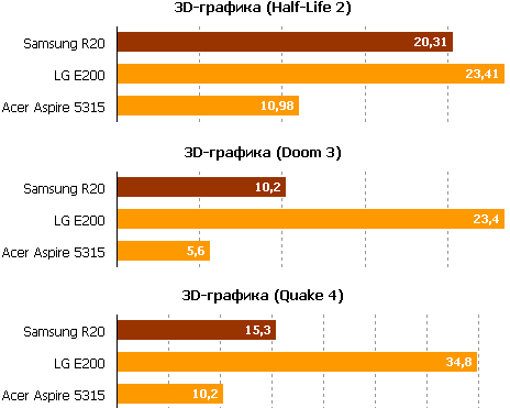 Игры только подтверждают все вышесказанное касательно производительности в трехмерных приложениях и влиянию на ее малого объема ОЗУ под Windows Vista. Рассматриваемый ноутбук довольно существенно отстает от LG E200 в Doom 3 и Quake 4, хотя в Half-Life 2 разница не такая большая. С другой стороны, это можно объяснить особенностью нашего демо-ролика, на котором измерялся FPS. Он больше зависит от скорости процессора, поэтому различия несколько сгладились.
