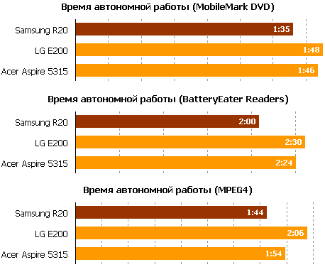 По времени автономной работы Samsung R20 также рекордов не ставит. Из-за малой емкости аккумулятора рассматриваемый ноутбук оказался на последнем месте в сравнении с другими, хоть и отстал всего на несколько минут.